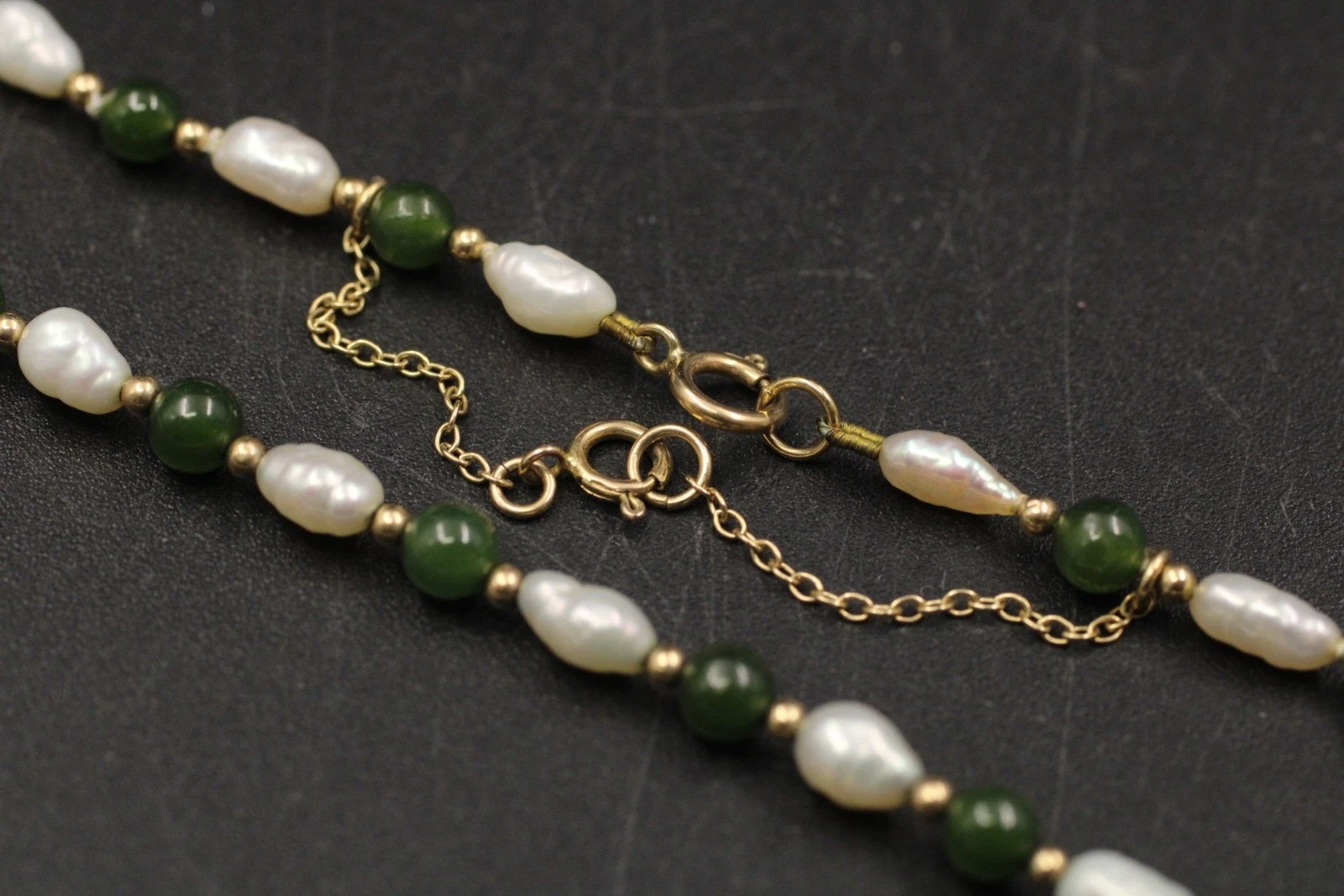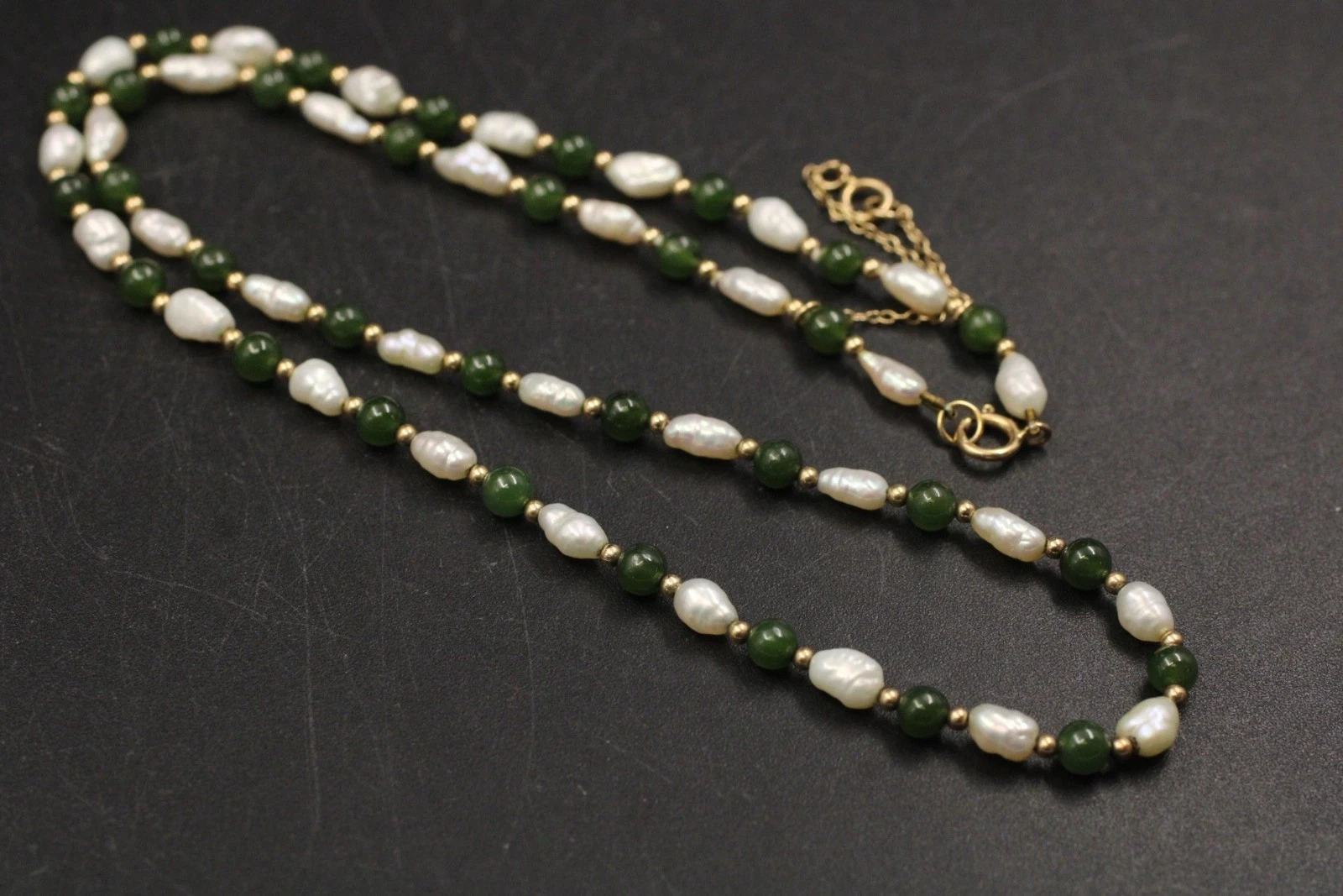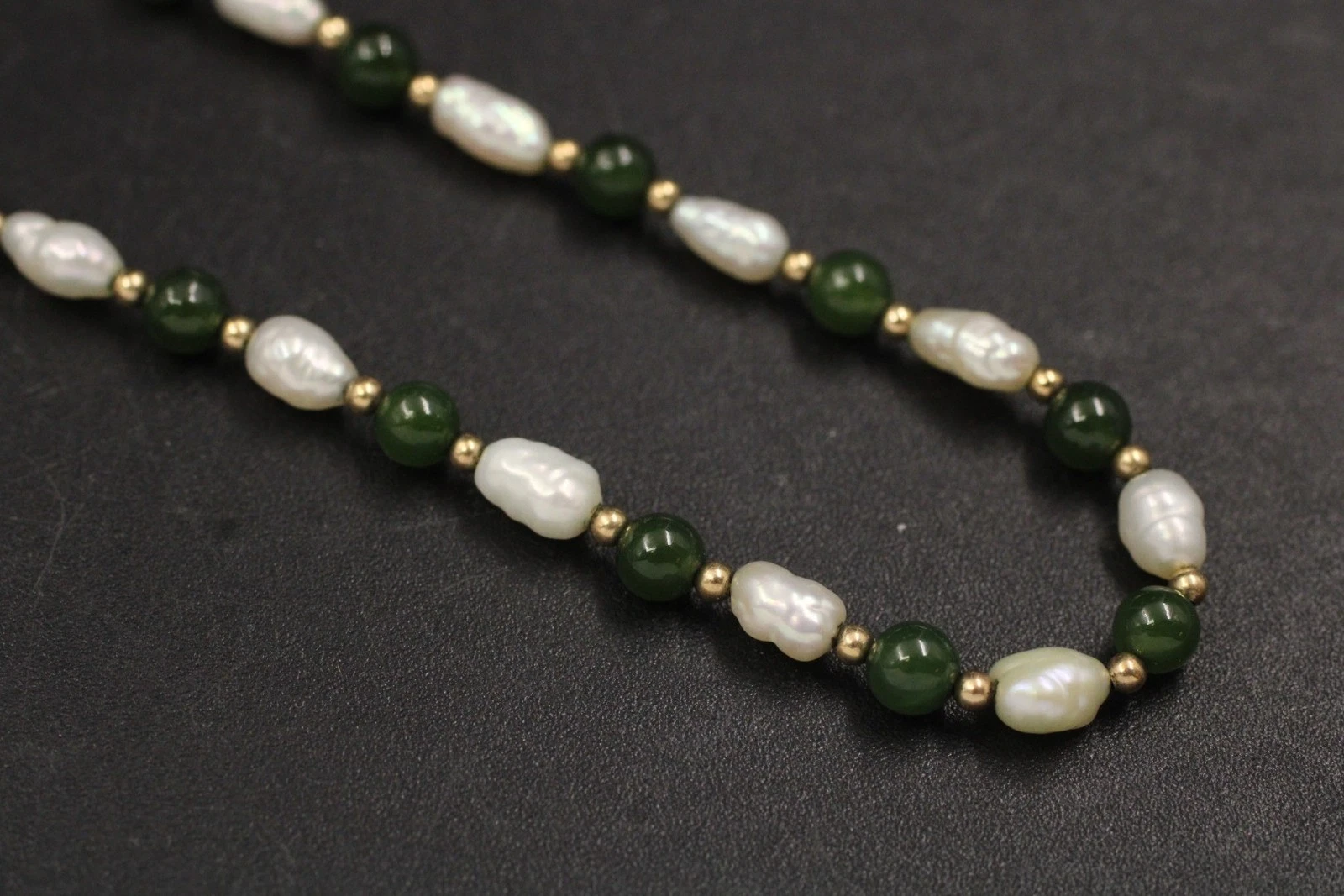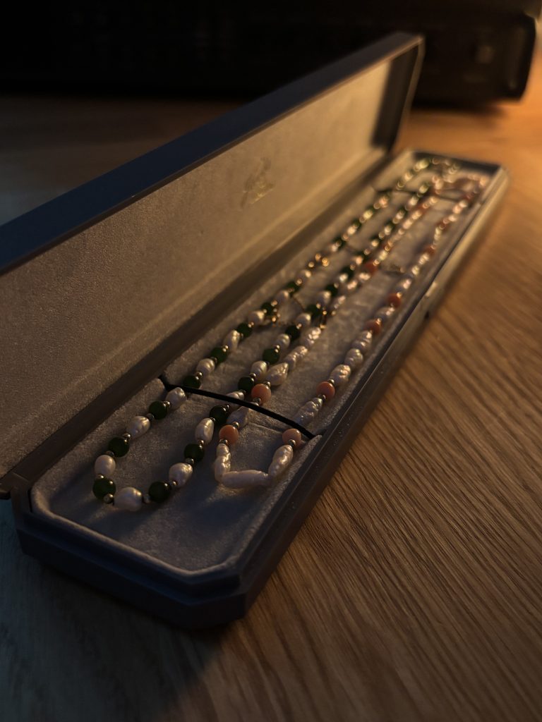 I completed a small set today, after another auction for the matching pearl necklace. Nephrite (left) and Coral. Rice pearls and gold, 9ct. 18” for me and 16” for hers.